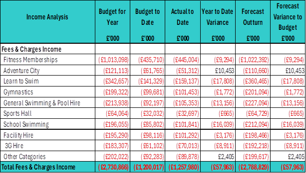 Fees & Charges Income – Memberships, Pay as You Go Activities, Facility Hire